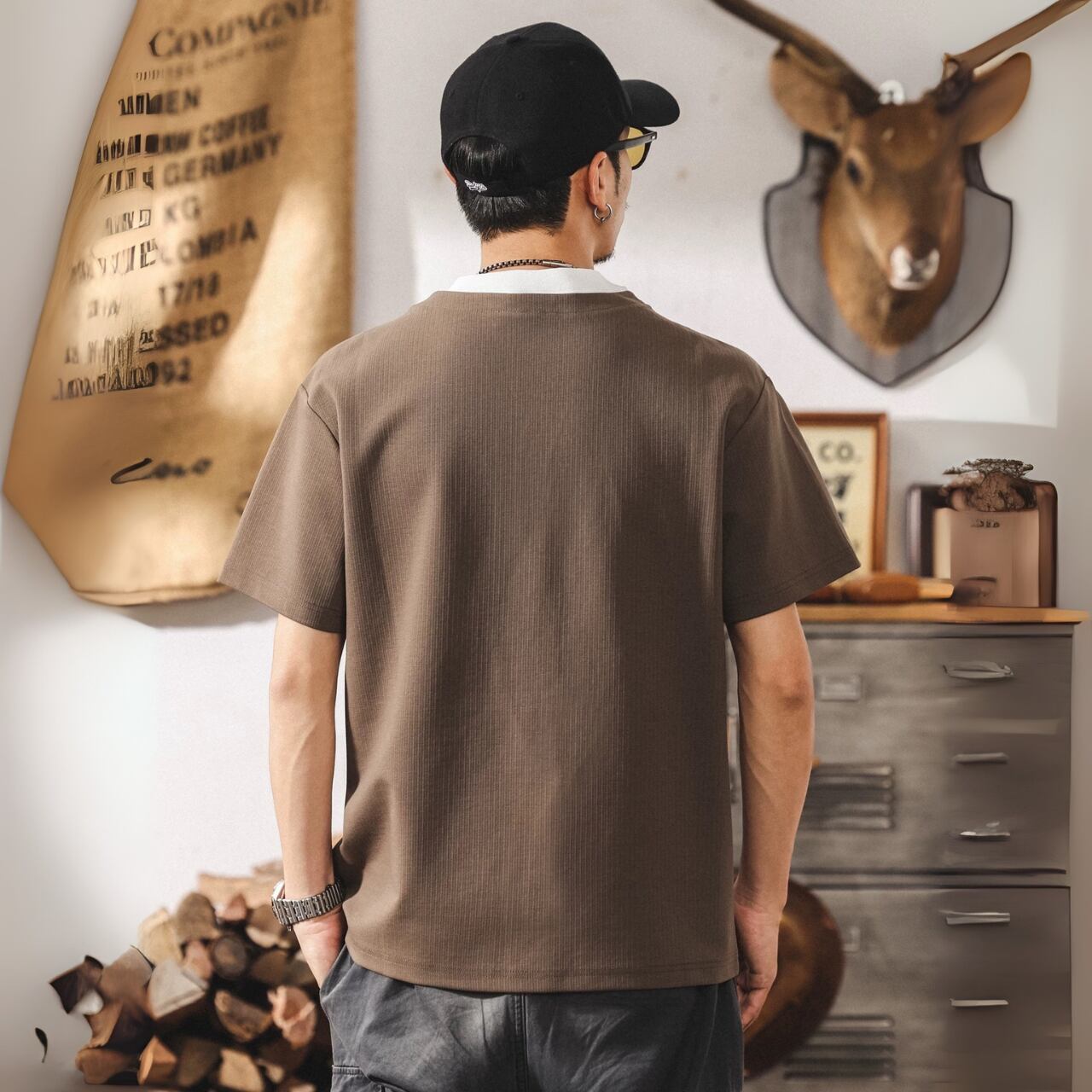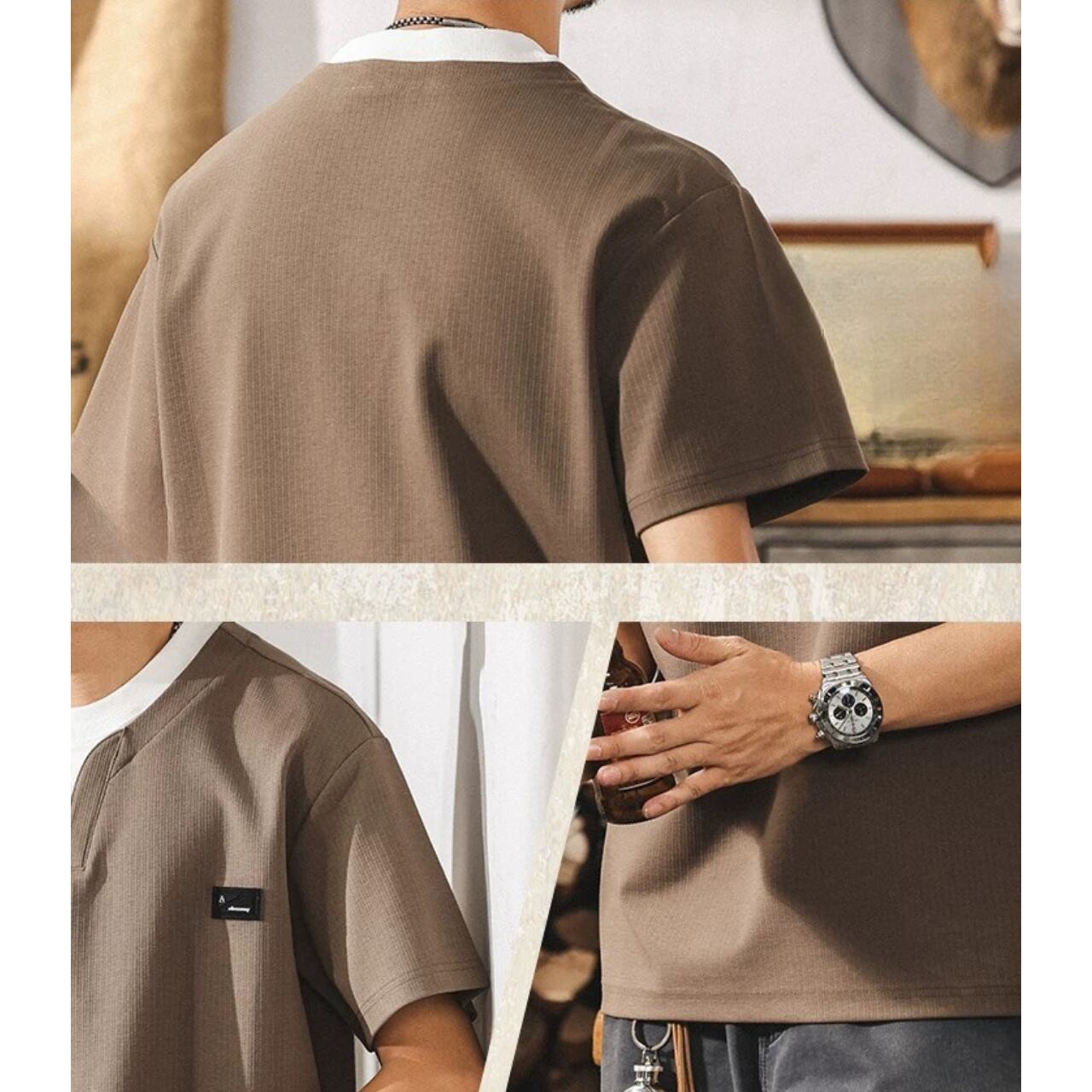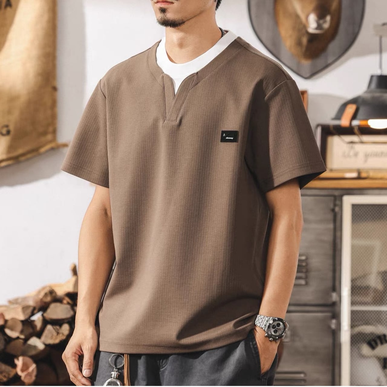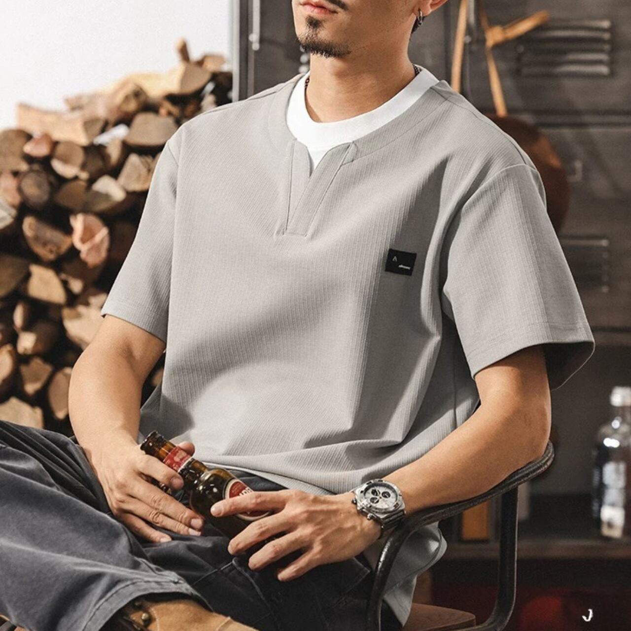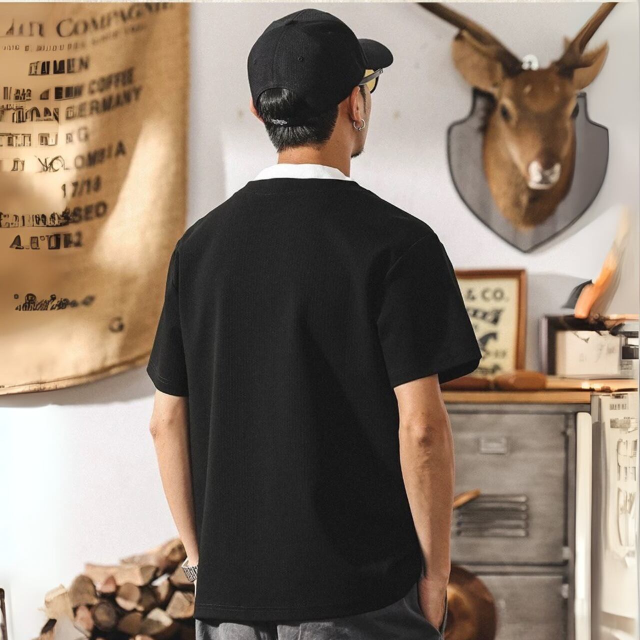 ヘンリーネック レギュラーフィット ボックスシルエットTシャツ 00548